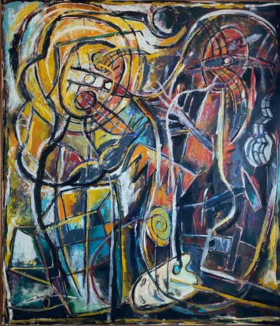 Image: Carlos Alfonzo (1950–1991), Artist and the Genie. Oil on canvas, 1987. 96 x 84 inches. On loan from Craig Robins Collection, Miami.